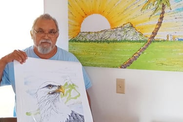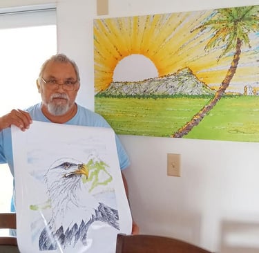 Highlighting Hawaii's Scenery & Culture through his artistry. Showcasing the vibrant traditions and deep connection of the Hawaiian people with their breathtaking natural surroundings. From the vivid colors of tropical flowers to the majestic sea life that inhabits the surrounding waters, each piece of art tells a story that resonates with the spirit of Aloha and the importance of preserving this unique heritage for future generations to come. Join us in exploring the rich tapestry of Hawaii's history, artistry, and the enchanting landscapes that inspire us all. In addition, Solomon's love for wildlife is also exhibited here...Malama Pono!